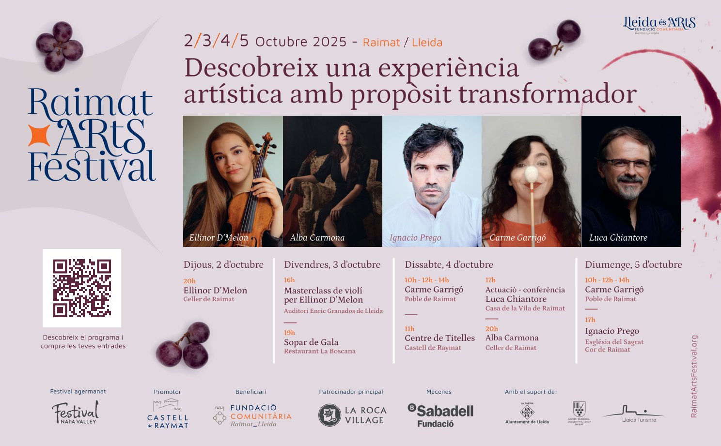 Àrea de Cultura, de Tradicions i de Participació Ciutadana El Raimat Arts Festival és una experiència artística multi sensorial que transforma la comunitat a través de les arts. Enguany es celebra la 4a edició, que tindrà lloc del 2 al 5 d’octubre de 2025 a Raimat i en benefici de la Fundació Comunitària Raimat Lleida, … Llegiu més