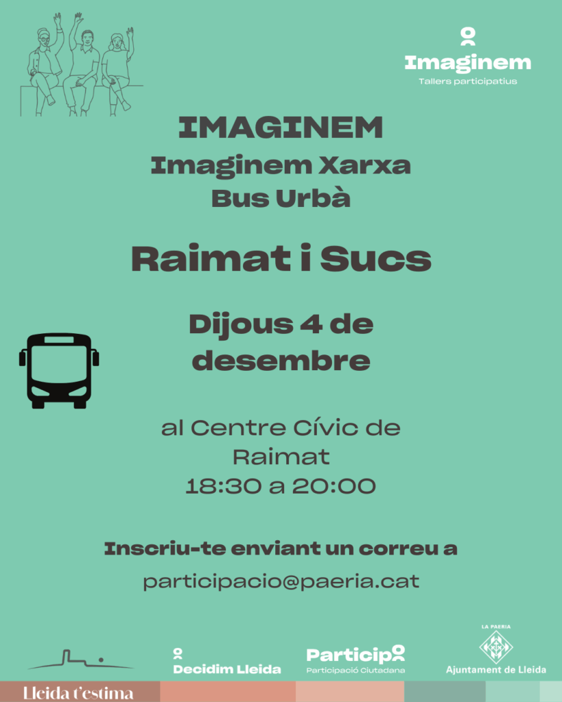 Des de la Regidoria de Participació Ciutadana i Drets Civils, conjuntament amb la Regidoria de Seguretat, Mobilitat i Civisme, us convidem al taller participatiu del projecte IMAGINEM la Xarxa de Bus Urbà, adreçat especialment al veïnat i a les entitats de Raimat i Sucs.