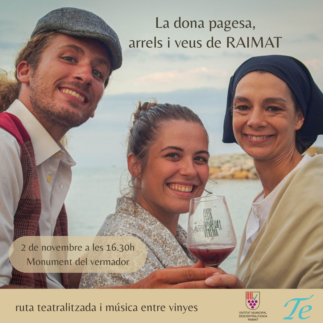 Vine a gaudir de “La dona pagesa, arrels i veus de Raimat”, una ruta teatralitzada amb música entre vinyes que ens farà viatjar a les arrels del nostre poble i al paper essencial de la dona pagesa en la nostra història 🍇🎭